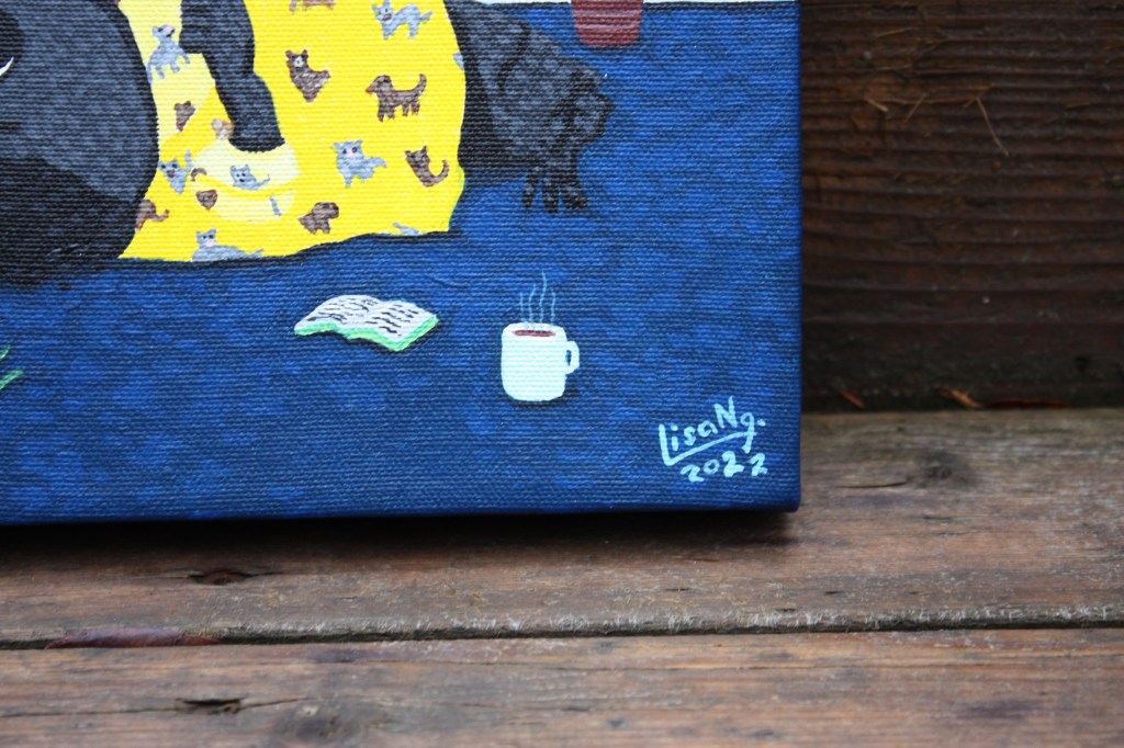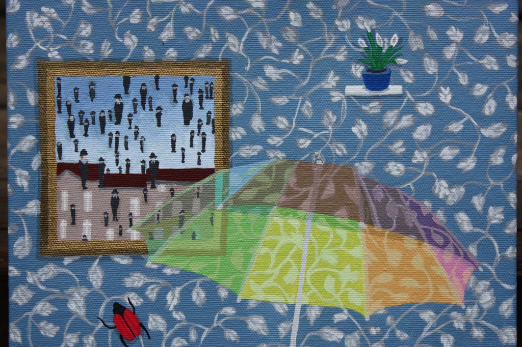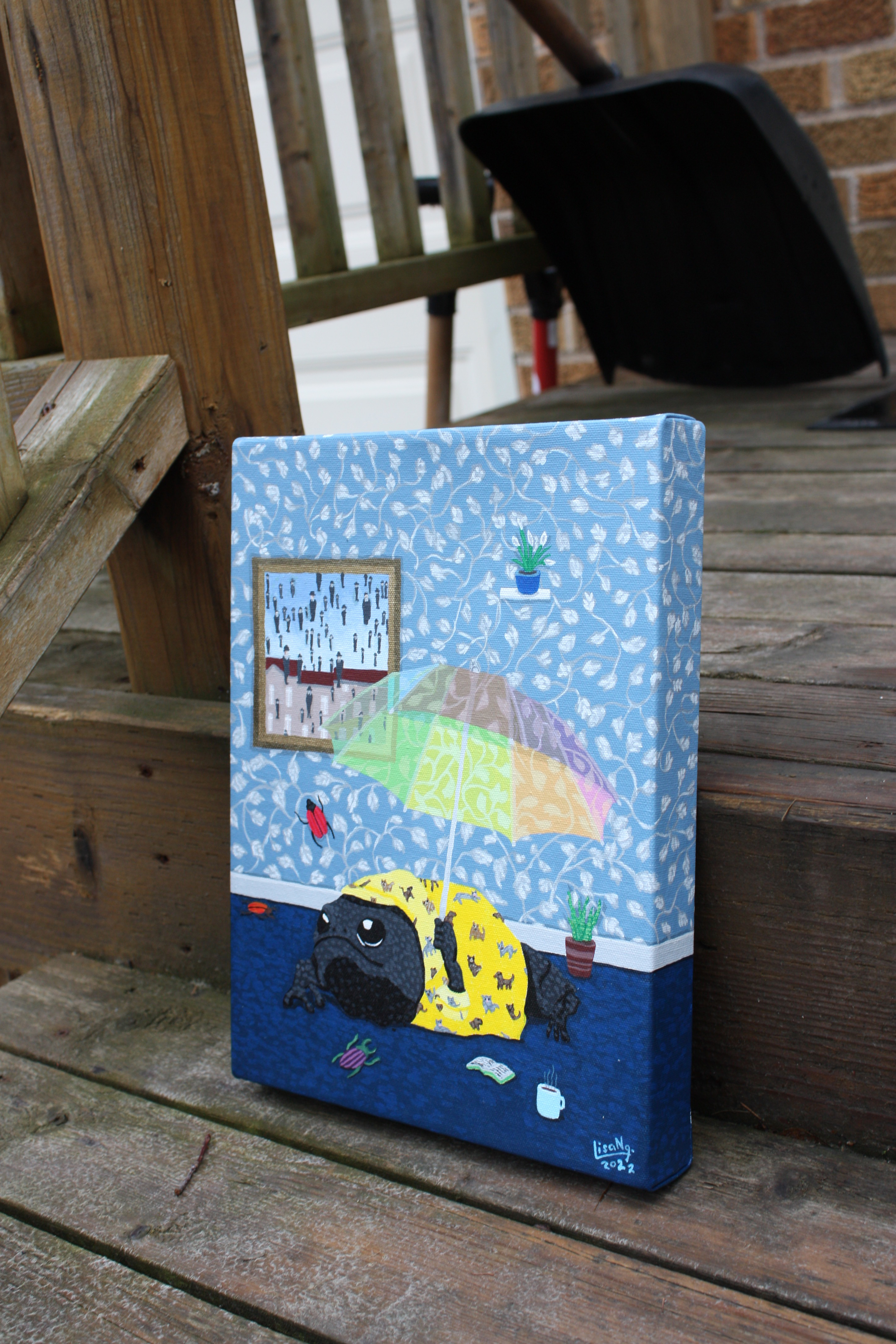 Black Rain Frog In Rain Coat acrylic on canvas 9 x 12 x 1.5 inches 2021 $400 CAD Another ugly animal in a cute outfit, this Black Rain Frog adorns a raining cats and dogs rain coat, complete with transparent rainbow umbrella. Curled up at home with a good book, a hot chocolate and some potted plants, all the rainy day cliches are included. A version of Rene Magritte’s 1953 painting of raining men in bowling hats, Golconda is also included. Part of a set of Animals In Cute Outfits: Taking a seemingly unfortunate situation and seeing for what it can be/ truly is: a unique, opportunity, a showing of beauty and glory! Featuring the world’s most underrated animals, be proud of who you are, personality and character go a long way.