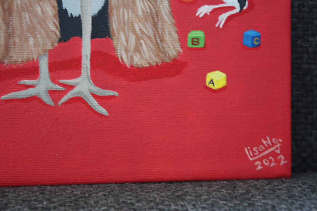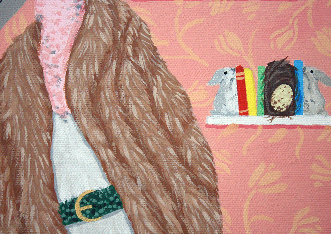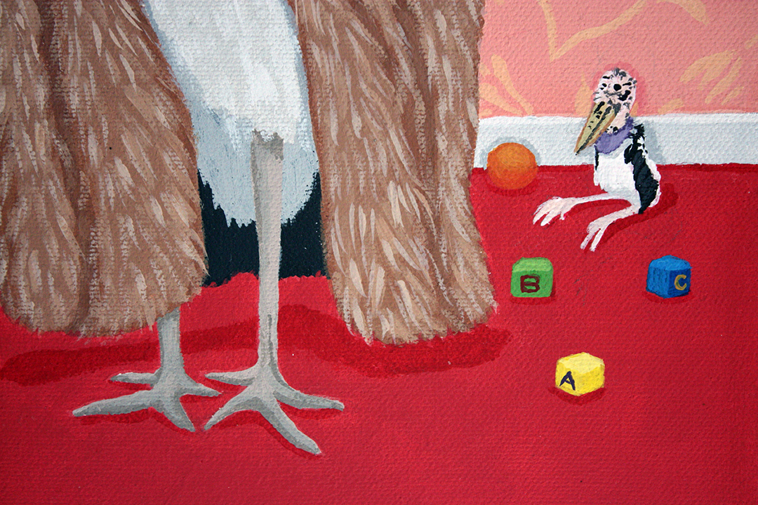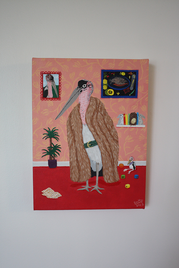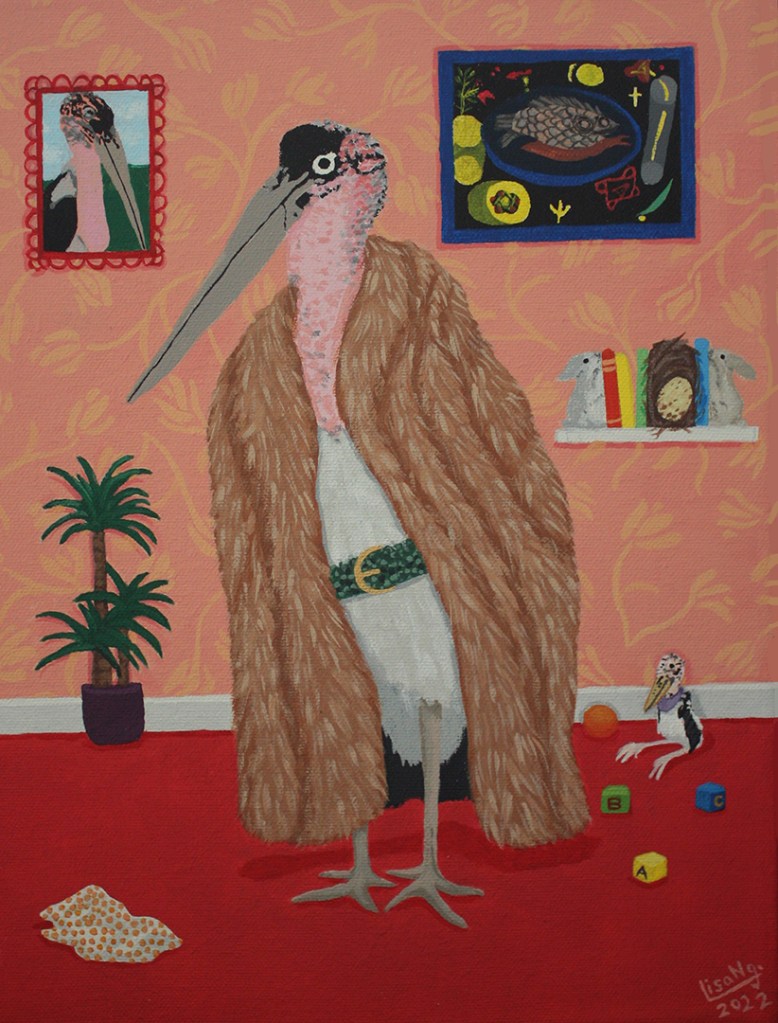 A Marabou Stork, part of the Ugly Animals In Cute Outfit series. The matriarch of the family, with baby in tow and another on the way, her other half is currently out getting fish but his presence hangs on the wall. In the upper right, Paul Klee’s, 1926, “Around the Fish” painting hangs. A carnivore by nature, the Marabou Stork adorns animal fur complete with snake skin belt and keeps a couple of taxidermy bunny book endings for decor-or is it all faux fur? Maybe she is an animal lover that just likes to keep up with the day’s fashions? It’s all open to interpretation.