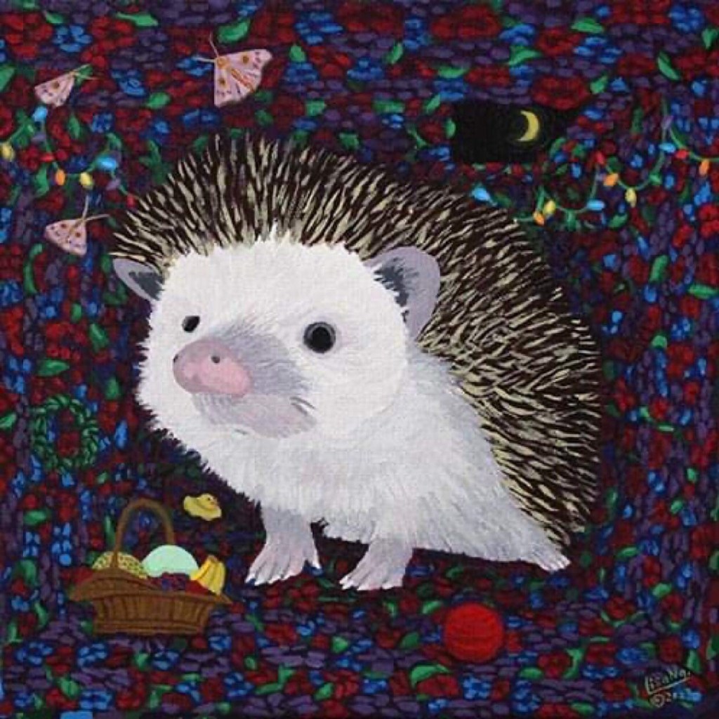 A hedgehog sits up at night nestled in a cozy room of purple, red and blue flowers. The moon shines in the skylight, a furry of moths visit, celebratory lights are present, a rubber ducky sits in the corner and a basket of fruit brings good fortune and prosperity. Completed a day before the artist gave an unexpected early birth to her second child (how’s that for nesting?), just hours before her water broke, in fact. Things turned out fantastic and this painting brings good surprises.