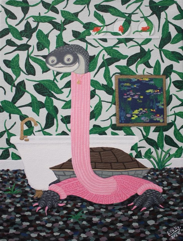 Who loves a good rainy day? This Roti Island Long Necked Turtle might. She likes moist environements, Monet paintings of lilies and keeps a collection of goldfish for pets. Check out those maniqured nails and did you find the hidden heart? Acrylic on canvas painting original 9 x 12 inches #turtle #cutepets #reptile #surrealism
