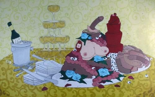 Wow I painted these 17 years ago.. I showed a series of 30 cannibal paintings for AWOL Gallery (now gone AWOL) in Toronto. I remember how lovely it was my friends showed up and met some fellow artists I would soon follow very closely as our careers blossomed overtime. It was an art show for artists, i think the general public was maybe weirded out? Most thought it was funny, but maybe too shy to buy. I didn’t sell a single one, which isn’t a great feeling when your peers are painting abstracts and selling at galleries already, or getting real professions in their 20s to 30s, buying houses and starting families. I was still scrambling, juggling minimum wage jobs and figuring out if i needed to go back to school to learn some real skills, practical ones, which I ended up doing. Despite all that, I’m still painting, never stopped, and look how far i’ve come! My work has evolved so much. In that time the Cannibal paintings sat in a darkend basement but slowly started to move, mostly online it garnered a cult like following. Most of the batch are gone now, these 3 big ones are still available. I will say the largest collection i know belongs to a plastic surgeon who bought in bulk, who I refer to as Hannibal Lector. Could you be a Hannibal Lector type? Or a Caligula? DM, it would be my pleasure to serve you up a dish! #surgeons #cannabalism