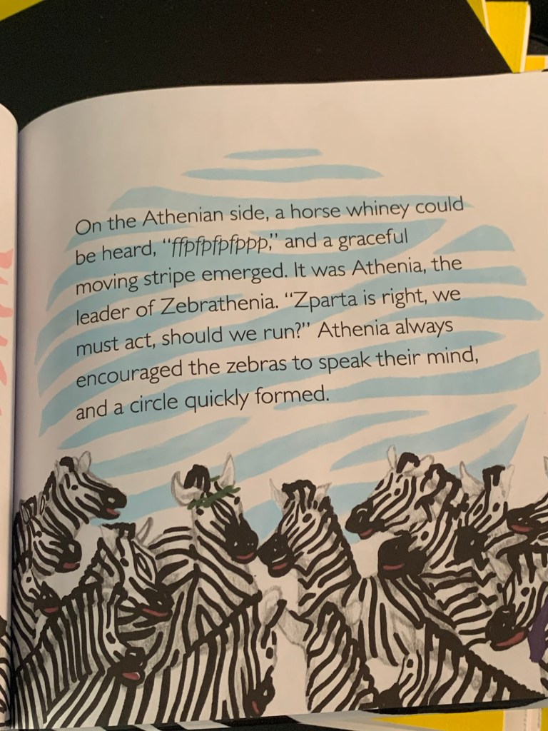 The title of the book, ZEBRATHENIA, steals from the first recorded democracy established in 6th century BC, the Greek city of Athens.