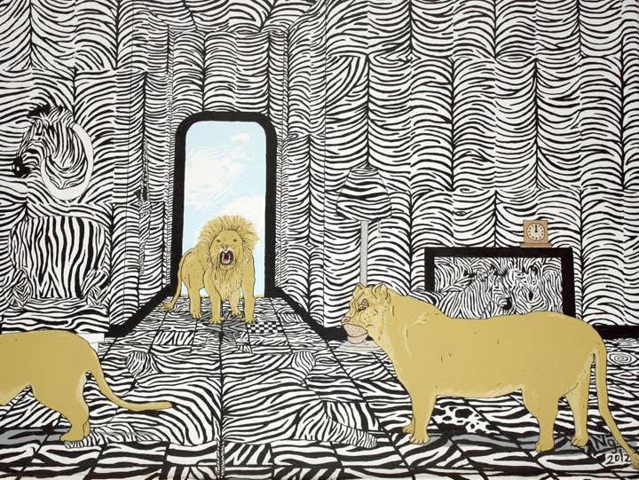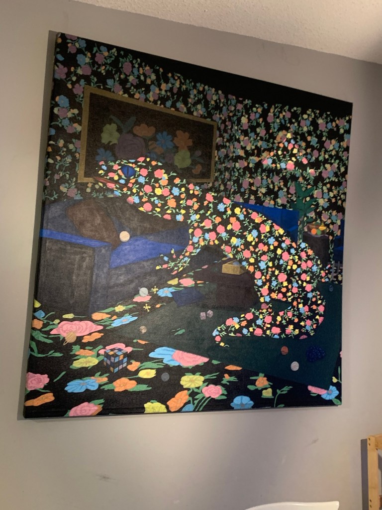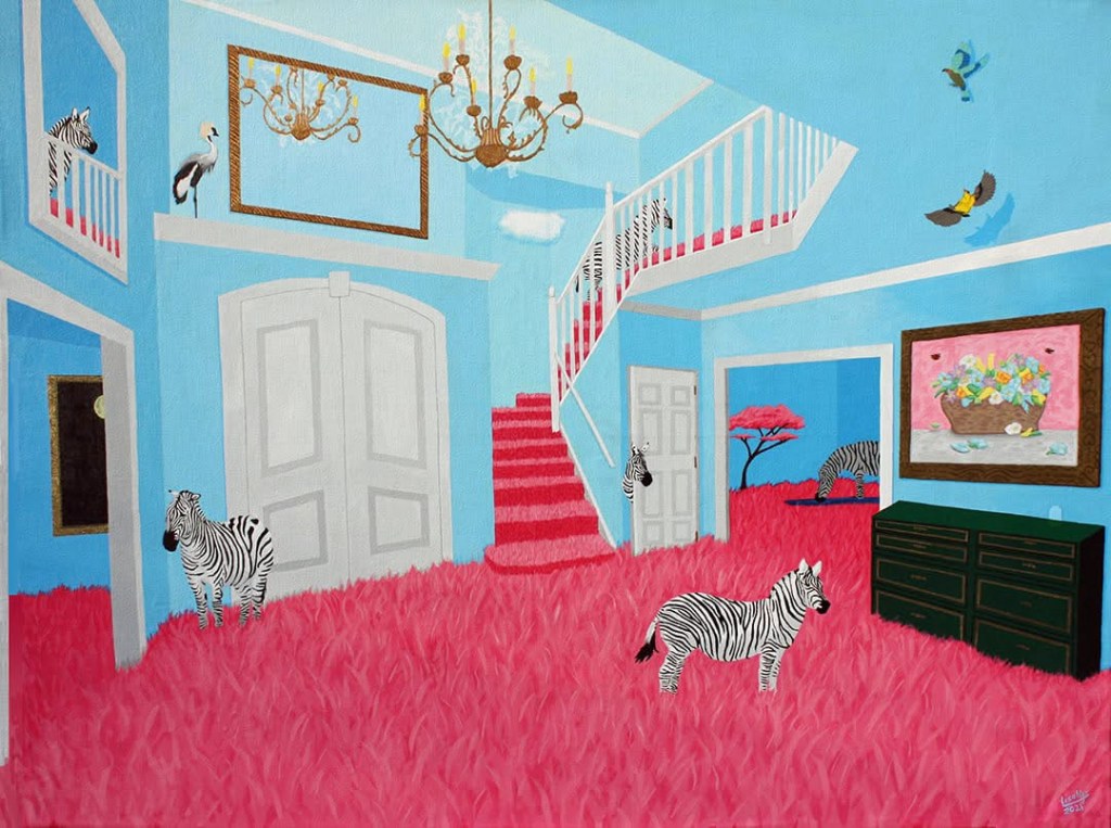 This painting has always captured the attention of audiences. It reminds me of my brother’s childhood bedroom. He really liked zebra prints, and so did my mom. My mom had no formal art education but she was a slick seamstress with an eye for patterns. She upholstered our whole house growing up, immigrant culture means being thrifty no matter your circumstance. So my brother had zebra print bed linens, curtains and chairs. I subconsciously took the room with me and threw some lions in. The end result was so fascinating I repainted the idea two more times, once in 2021 and again in 2023: