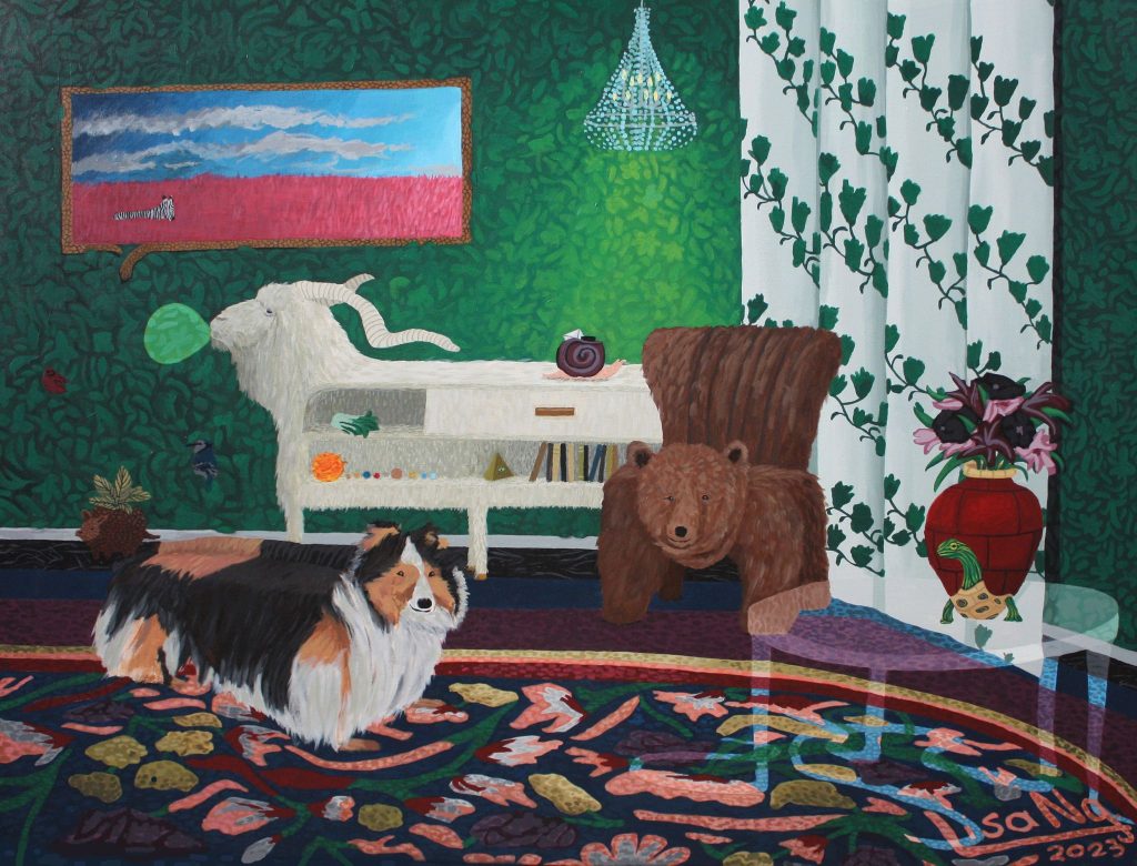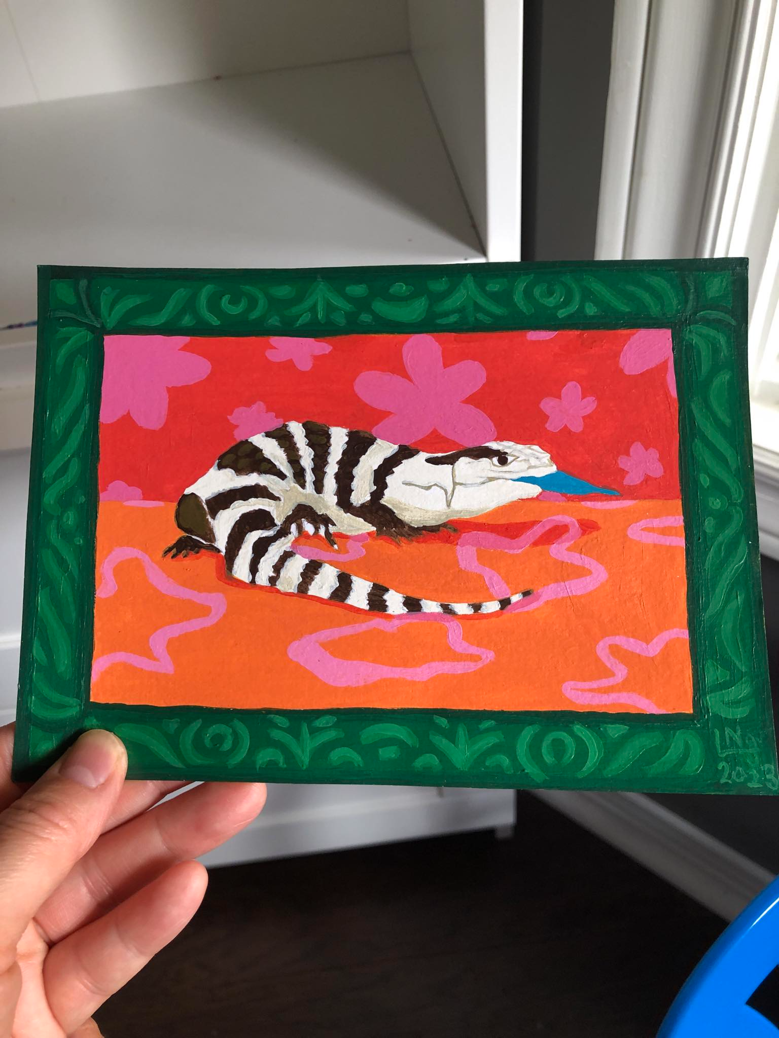 Pets aren’t allowed in the building so when she says she has to tend to her painting of a blue tongued skink, she means just that.