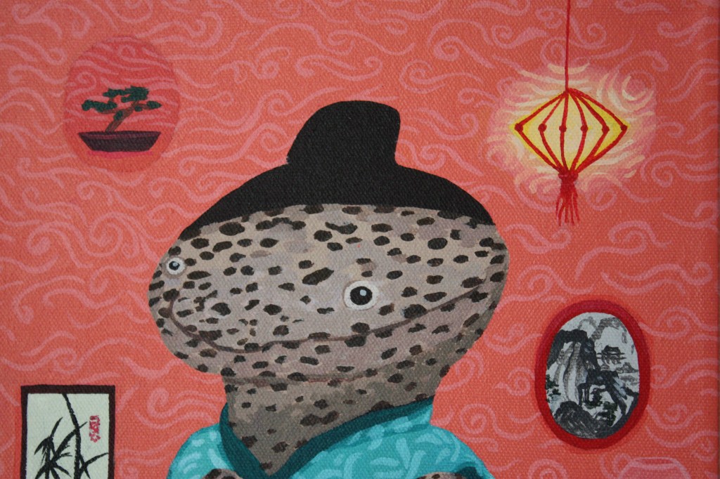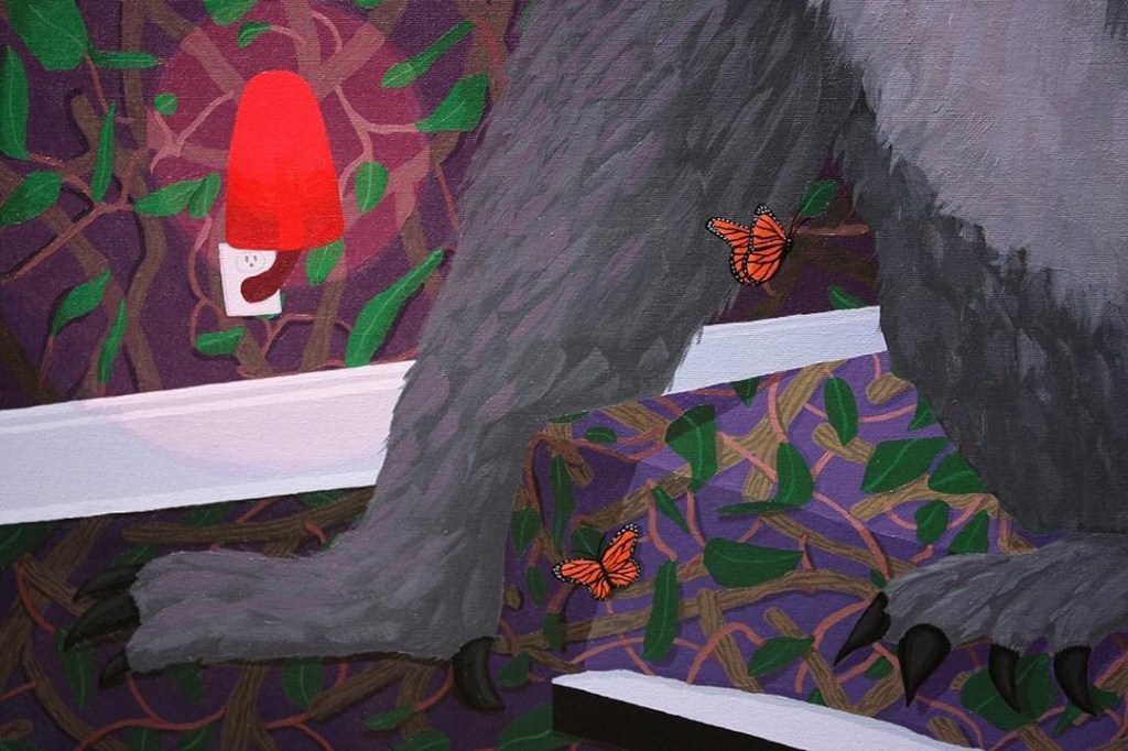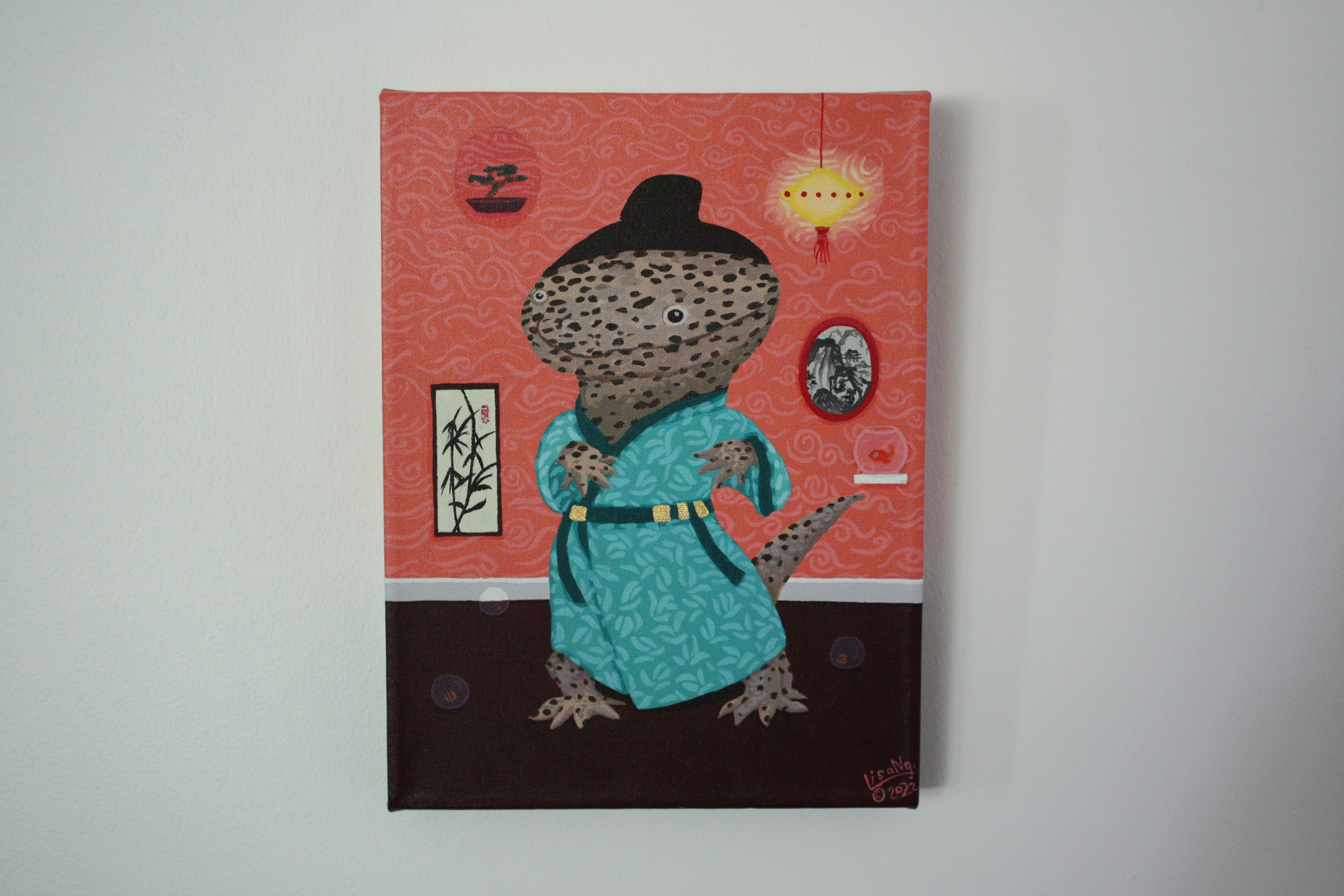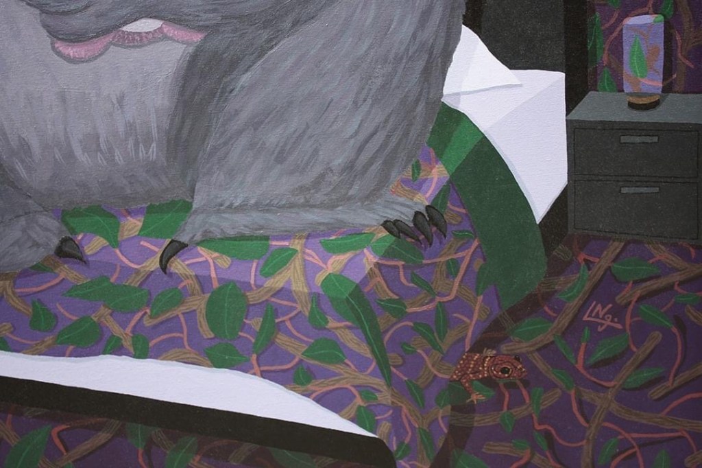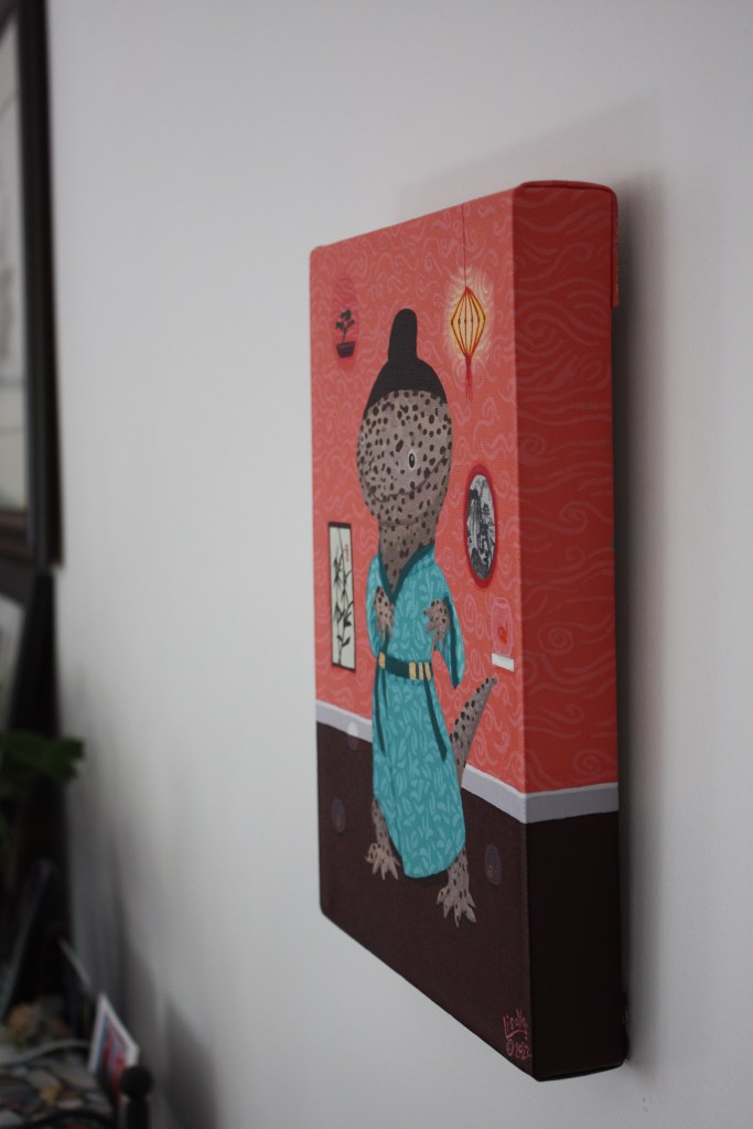 From my giant animal in tiny rooms series, koalas sleep a lot so I put him in the bedroom. Comes with a mushroom night light and a few hidden animals from the eucalyptus forest. Painting comes with a koala stuffy, a bedside lamp, and a gentle view of the moon also. A good thing to have in the nursery or bedroom maybe? Painting is night themed but might also run the risk of keeping you up at night, depending on how you feel about monster sized koalas..