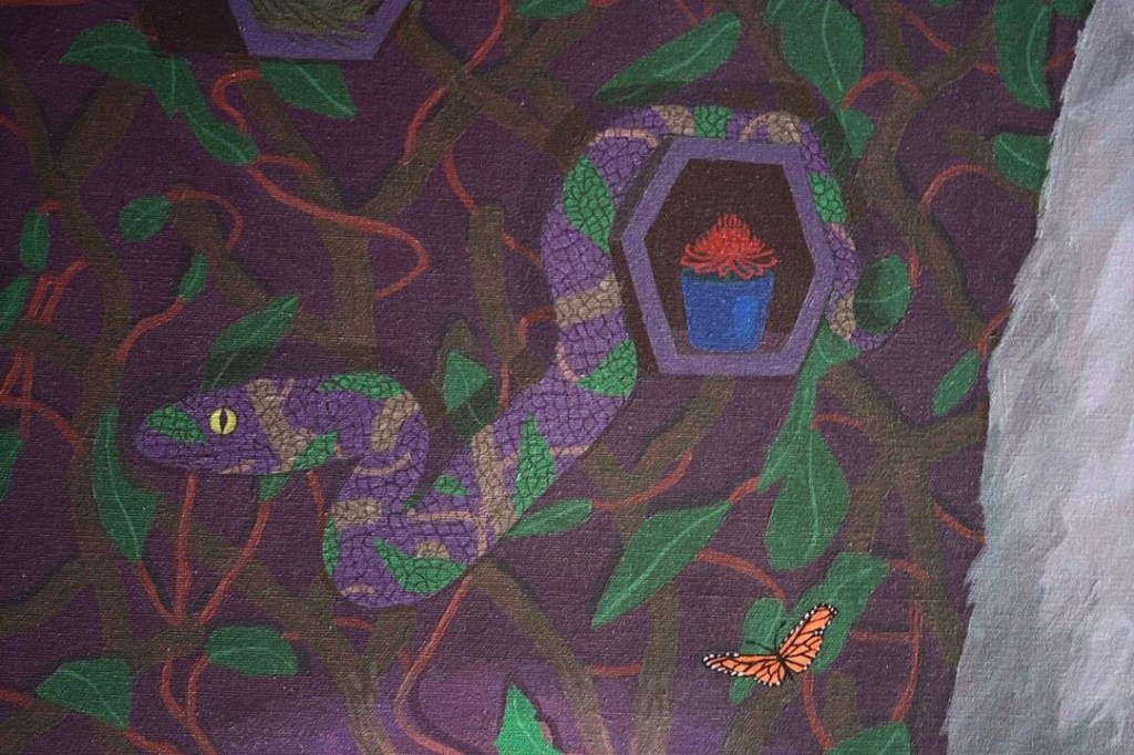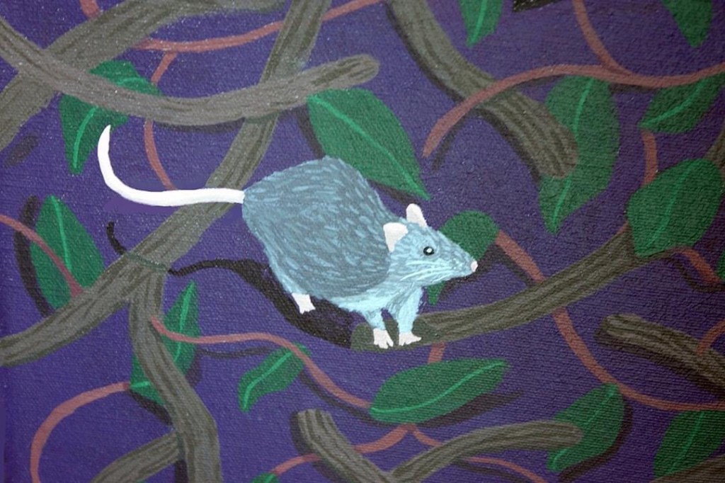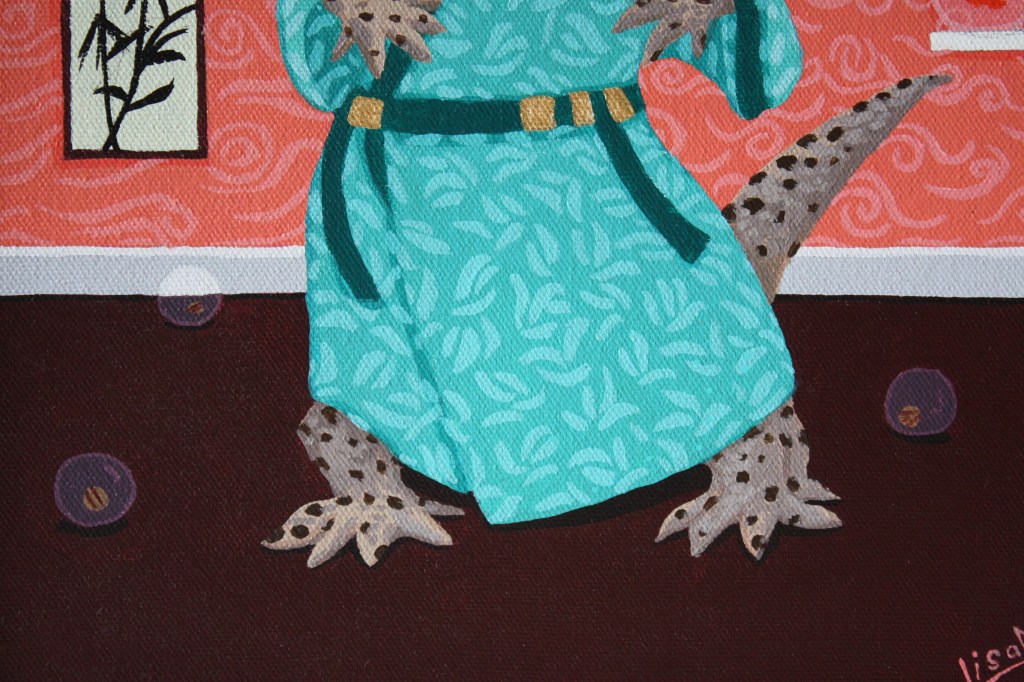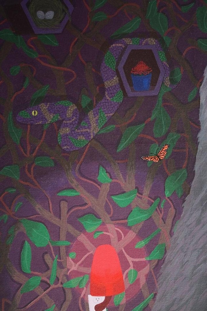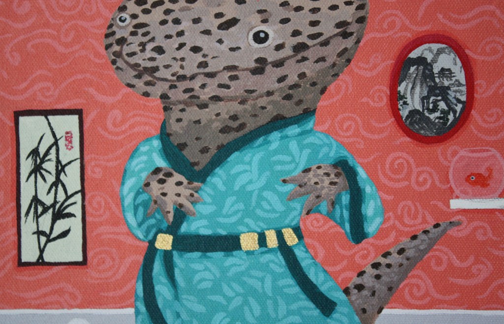 From my giant animal in tiny rooms series, koalas sleep a lot so I put him in the bedroom. Comes with a mushroom night light and a few hidden animals from the eucalyptus forest. Painting comes with a koala stuffy, a bedside lamp, and a gentle view of the moon also. A good thing to have in the nursery or bedroom maybe? Painting is night themed but might also run the risk of keeping you up at night, depending on how you feel about monster sized koalas..