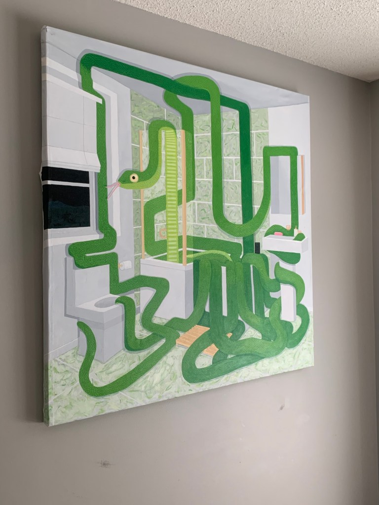 Painted in 2019, just before the pandemic, this will be the snake’s first public debut. Alongside the Chinese New Year of the snake and more specifically the wood snake, characterized by the colour green, in the year 2025, this event only happens once every 60 years!! -the real reason I took this year to fish it out of the basement, restretch it and apply with it to this years Hamilton Art Gallery Show and Sale and it got in! I’m showing 2 other monster works and 2 smaller ones as well, all public debuts.
