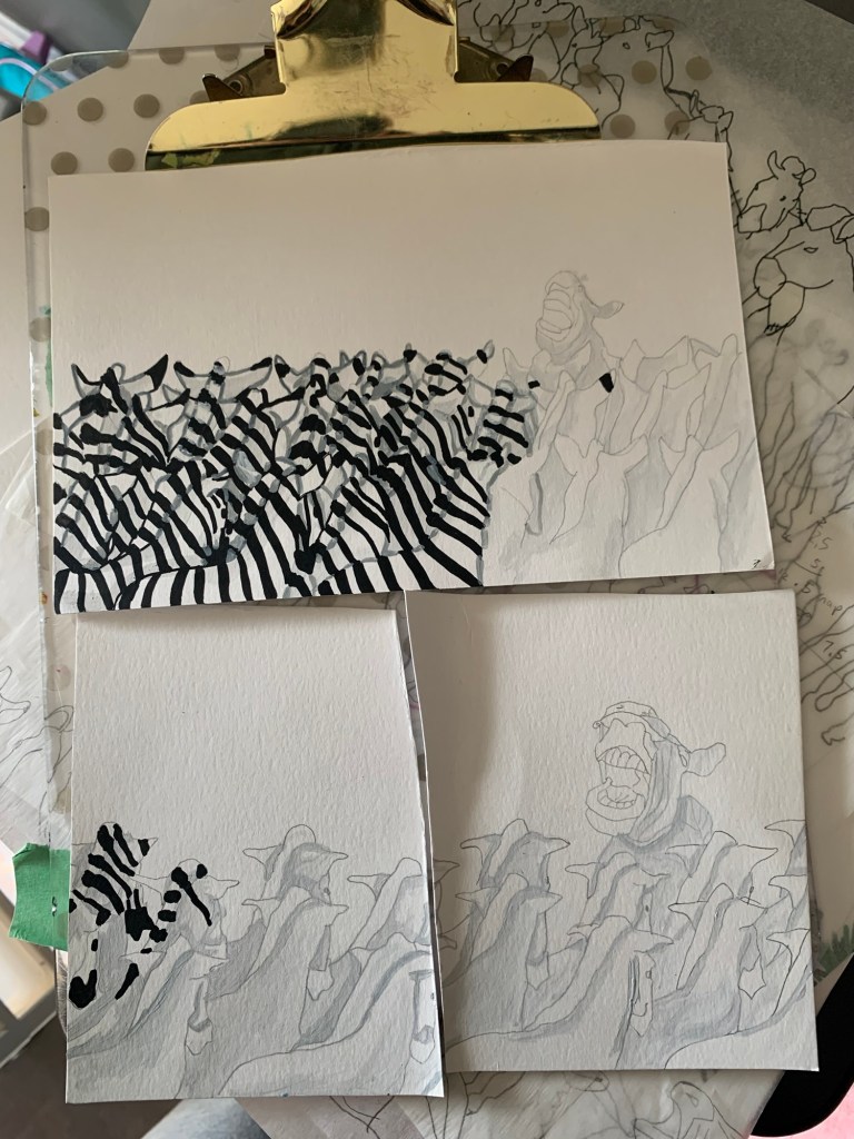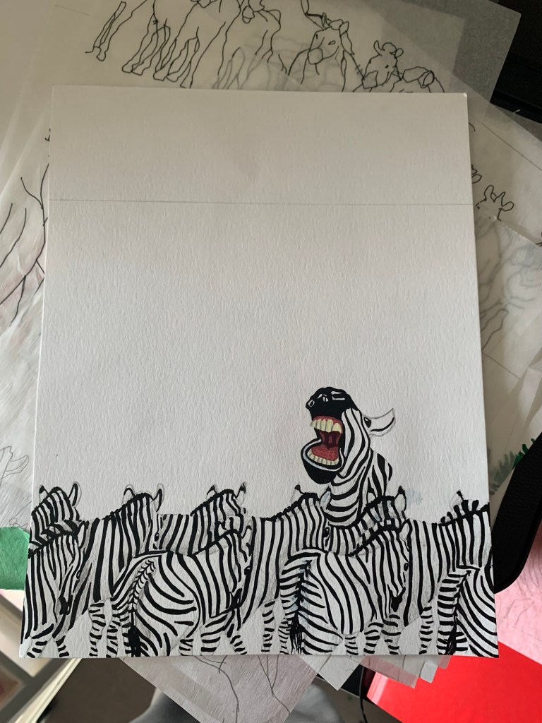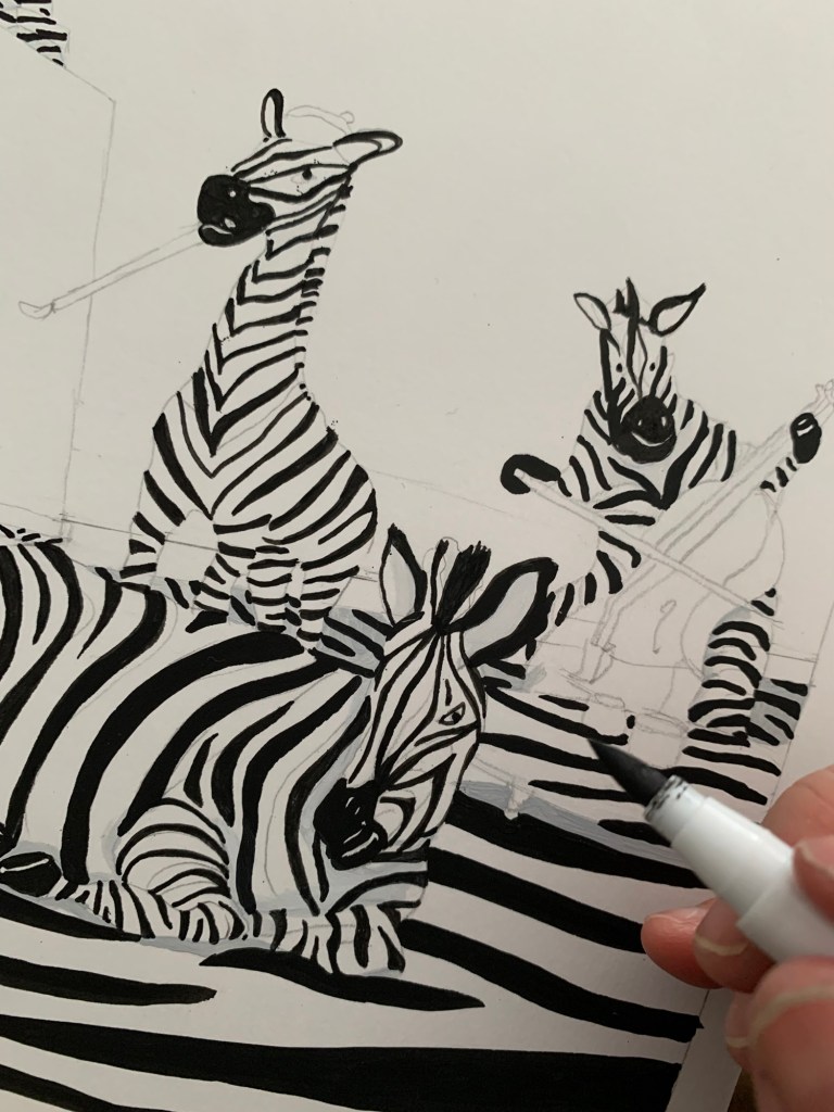 Writing and illustrating my first picture book has got me in a dizzy. Did you know a group of zebras is called a dazzle? It took me 3 tries to get this scene right.